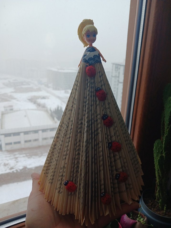 Kitap sayfalarından yapılmış, üstü oyuncak bebek başıyla süslenmiş ve küçük uğur böceği aksesuarlarıyla detaylandırılmış figürin.