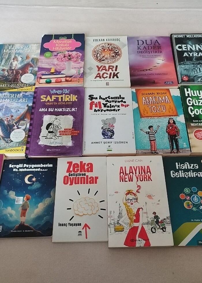 Saftirik 100 Menekşe 50 Yarı açık 20 Ejderha Muhafızları 50 tanesi Dua Kader Değiştirir 90 Abartma Tozu 90 Şu Hortumlu Dünyada fil yanlız bir hayvandır 60 Huyu suyu güzel çocuk 100 Cennet Ayracı 60 Hafıza Kitapları 10 tl tanesi Benim en iyi arkadaşım 70 Alayına New York 25 Sevgili Peygamberim Hz. Muhammed 30 Toplu alım için son fiyat 730 TL dir toplu almayacaksanız ayrı ilan açacağım