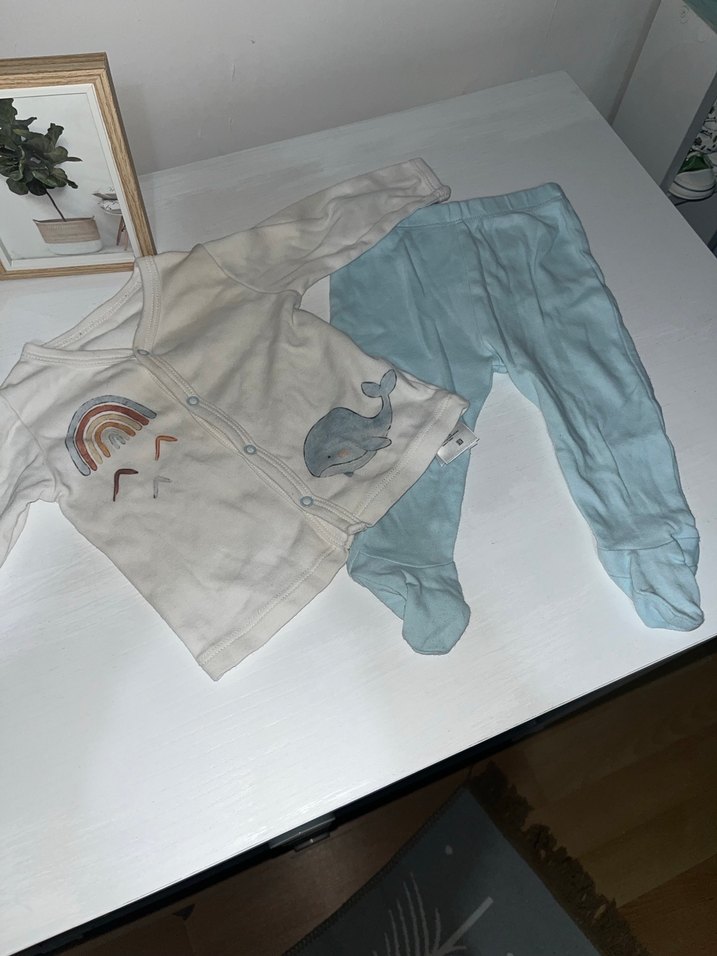 Beyaz uzun kollu düğmeli üst, notched lapel yaka ve baskılı desenlere sahip. Pastel mavi, ayaklı, yumuşak ve sıcak kumaştan pantolon içerir.