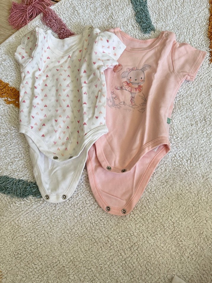 Bu set, düğmeli ve kısa kollu, pastel tonlarda iki kız bebek body'si içerir. Biri nakışlı desenlidir ve kolay giydirme sağlar.