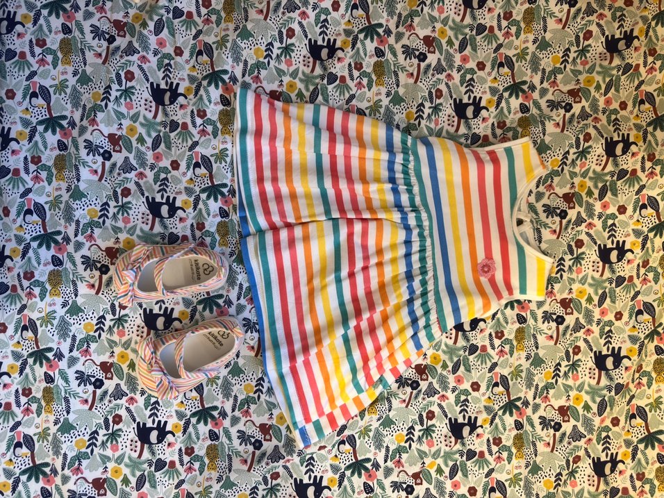 Kitikate Marka 3&6 aylık, Yumuşak pamuklu kumaştan yapılmış, canlı renkli, çizgili desenli çok renkli kız bebek elbisesi. En fazla 2 defa giyilmiştir.