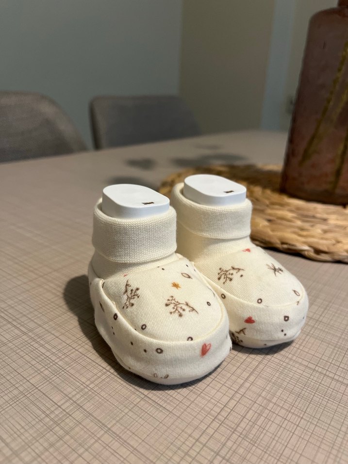 Kitikate marka (0-3 ay) %100 pamuk Nakışlı çiçek desenli, örgü bilek kısmı olan beyaz bebek ev terliği. Yumuşak ve sıcak kumaşı var Hiç kullanmadım sadece etiketini kopardığım için yok Kategori olarak kız seçtim fakat unisex üründür. Ölçü : 0-3 ay (50-62 cm)