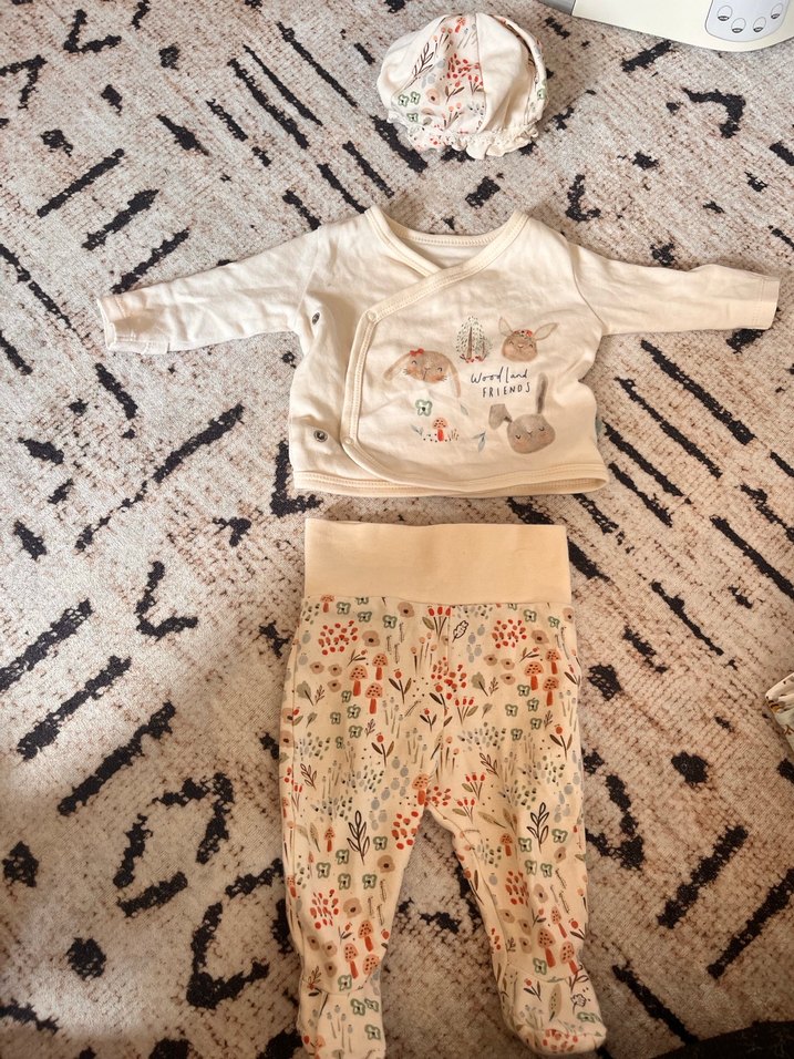 Pamuklu, uzun kollu, örgü detaylı üst, desenli pantolon ve uyumlu şapka içeren bebek bohem tarzı takım. Hafif renklerde ve straplez yaka tasarımıyla.