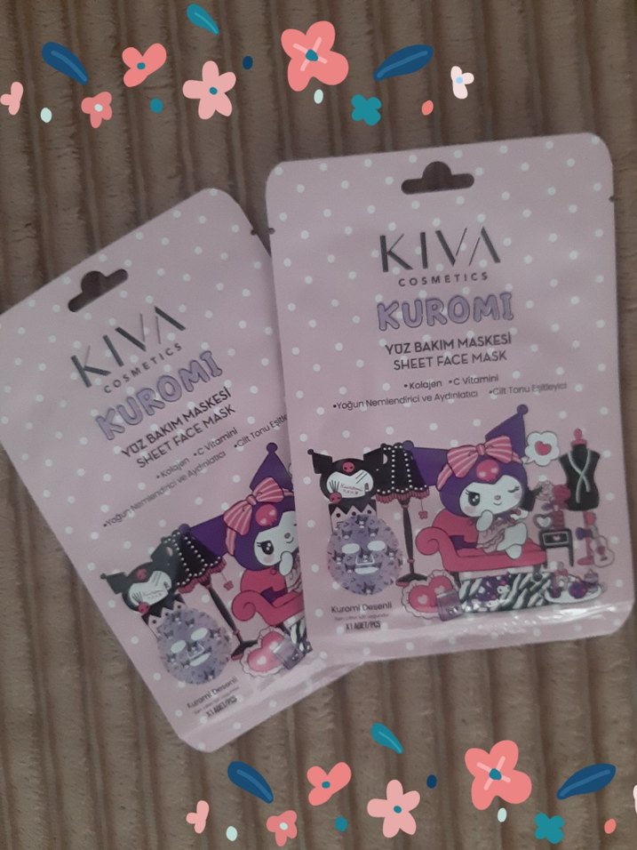 Kiva Kuromi yüz bakım maskesi, kolajen, C vitamini, %100 doğal içerik ve arbutin ile cilt bakımı sağlar.
