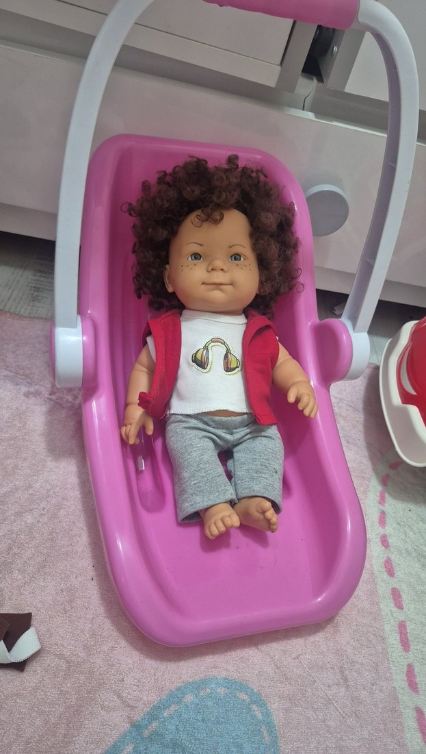 Kıvırcık saçlı bebek, beyaz desenli tişört ve kırmızı yelek giyiyor. Pembe taşıma koltuğu ile birlikte geliyor.
