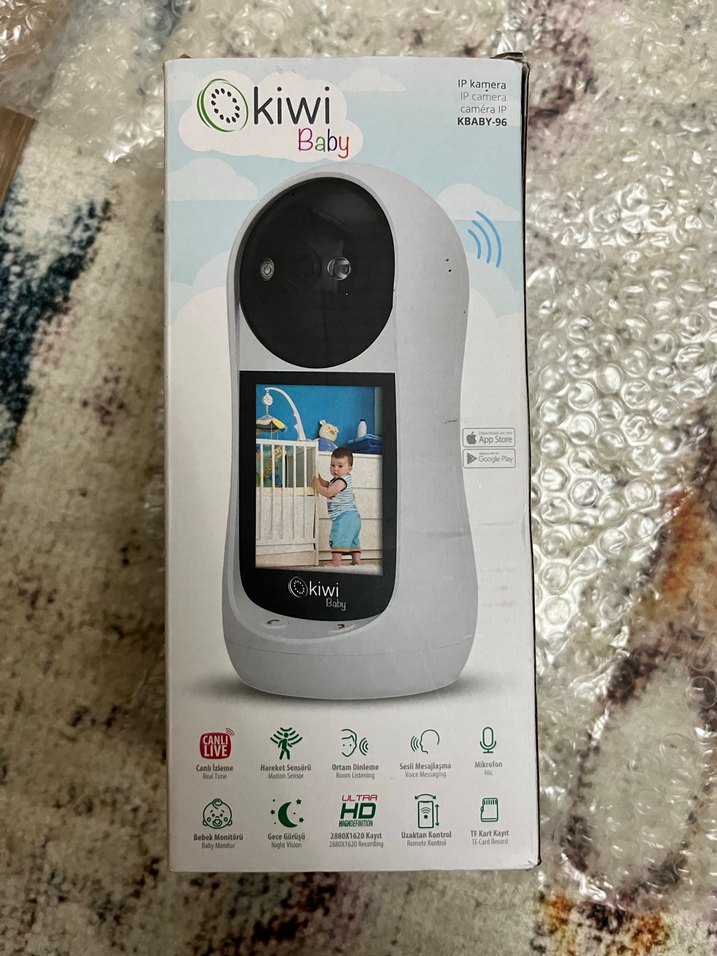 Kiwi Baby bebek kamerası , sıfır üründür HD video, çift yönlü ses ve gece görüşü ile net izleme sağlar.
