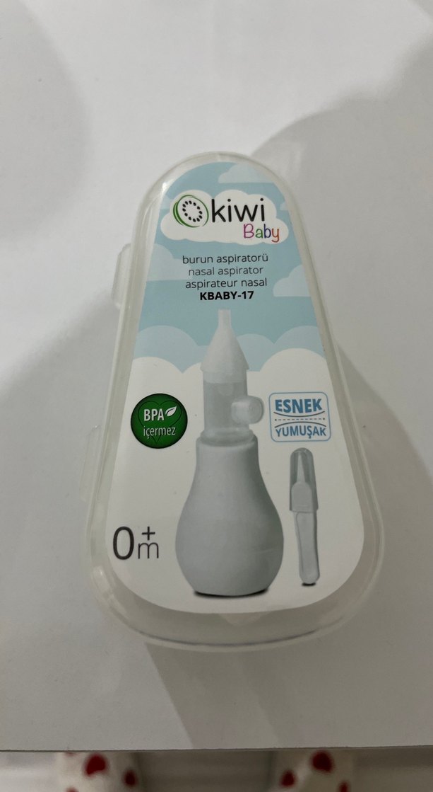 Kiwi Baby burun aspiratörü esnek ve yumuşak yapıya sahiptir, BPA içermez, 0+ ay bebekler için uygundur. Koruyucu kutu ile birlikte gelir.