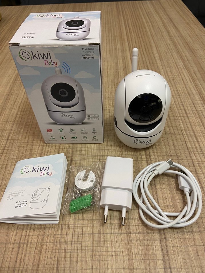 Kiwi Baby beyaz kablosuz bebek kamerası, HD görüntü, gece görüşü ve çift yönlü ses özellikleri sunar. Montaj aparatları ve şarj cihazı dahildir.
