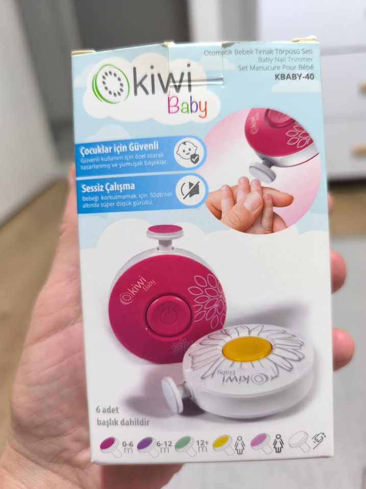Kiwi Baby otomatik bebek tırnak törpüsü seti, çocuklar için güvenli yumuşak başlıklar ve sessiz çalışma özelliği sunar. 6 adet başlık dahildir, pilli ve sağlamdır tek başlığı bir kaç kere kullanıldı diğer başlıklar hiç kullanılmadı.✂️