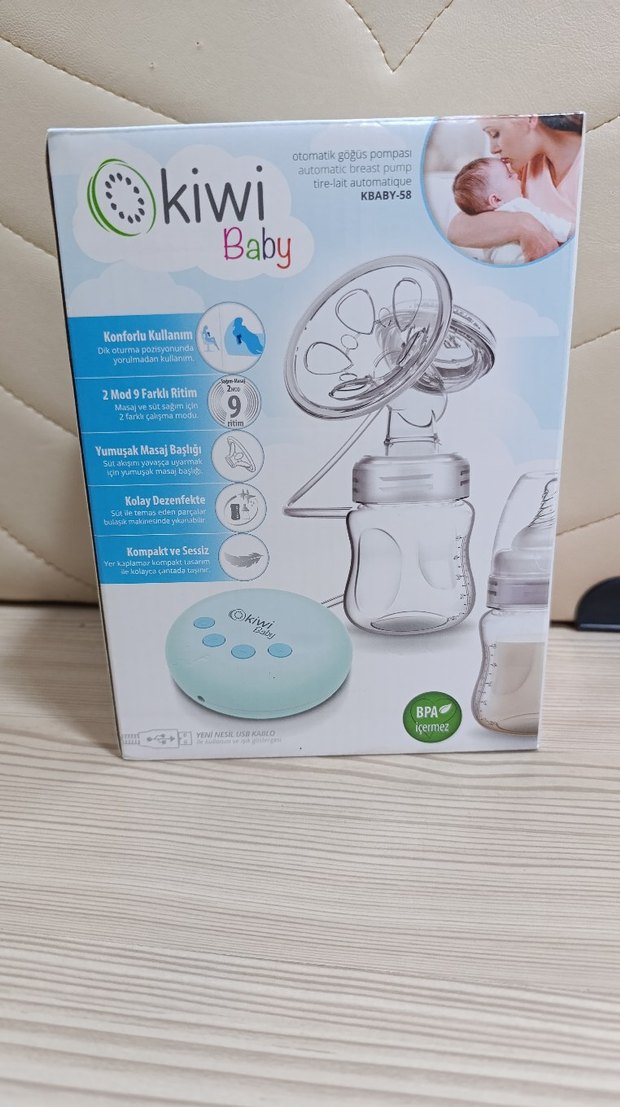 Kiwi Baby otomatik göğüs pompası, konforlu kullanım için ayarlanabilir oturma pozisyonu, 2 mod 9 ritim, yumuşak masaj başlığı, kolay dezenfekte edilebilme ve kompakt sessiz tasarıma sahiptir. BPA içermez.