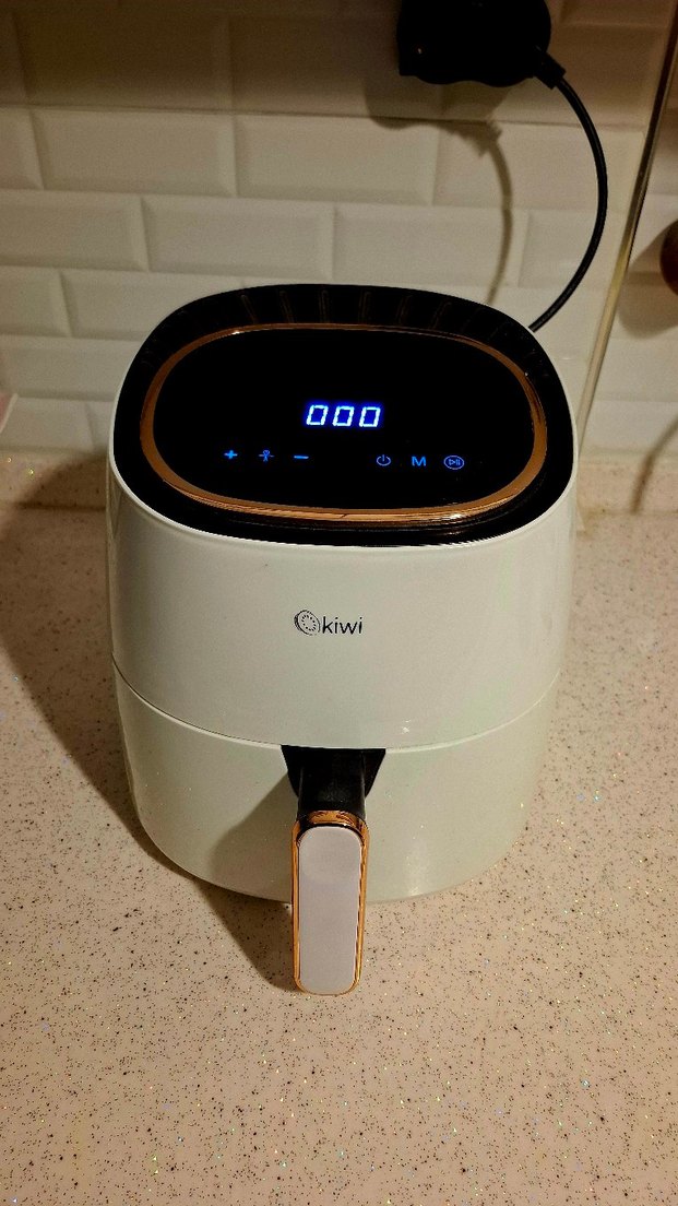 Kiwi beyaz hava fritözü, dijital kontrol paneli ve LED ekranıyla kolay kullanım sağlar. Şık tasarımı ve dokunmatik tuşlarıyla pratiktir. En fazla 2 kere kullanılmıştır. 5 litredir.