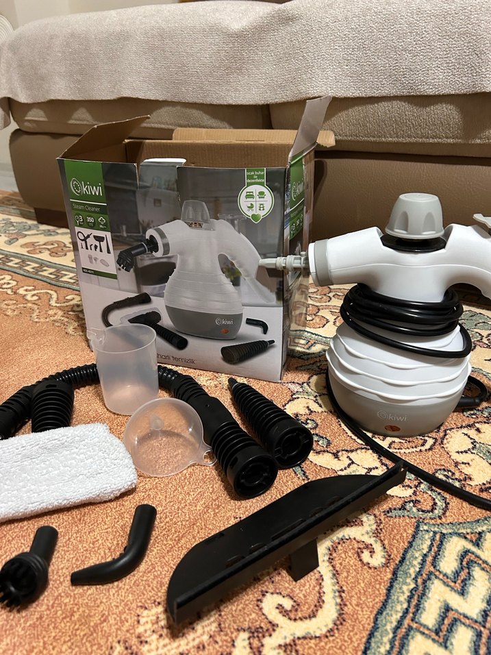 Çoklu başlık ve aparatlar içeren Kiwi buharlı temizleyici ve vakum, beyaz-gri kompakt tasarıma sahip. Ölçü kabı ve bez de dahil.