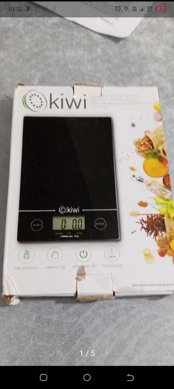 kiwi siyah dijital mutfak tartısı, yüksek hassasiyet, 5 kg kapasite, otomatik kapanma ve tartı fonksiyonuna sahiptir.Hediye geldi köşesinde ufak sıyrık var kullanmaya engel değil ihtiyaç fazlası kutusuyla sıfır.