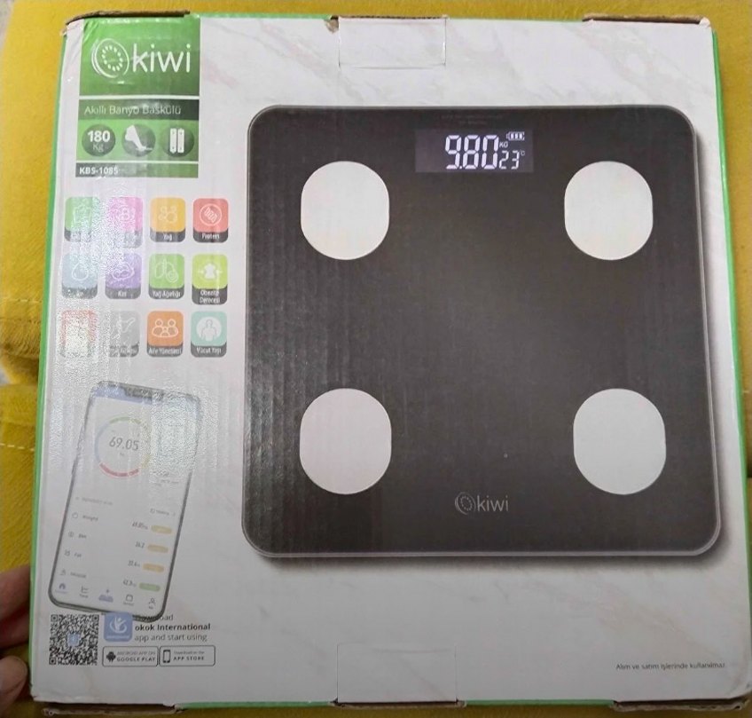 Siyah renkli Kiwi dijital tartı, ağırlık ve sıcaklık göstergeli net ekran ve dört sensörle doğru ölçüm sağlar. İhtiyaç fazlası olduğu için satıyorum. Çok az kullanıldı yeni ve temizdir. Ciddi alıcılar iletişime geçebilir