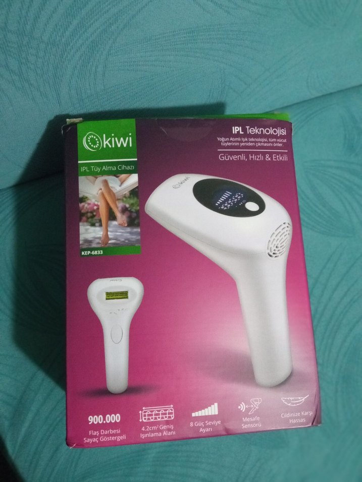 Kiwi IPL lazer epilasyon cihazı beyaz renkte, 900.000 flaşlı IPL teknolojisiyle etkili ve güvenli kullanım sağlar. 4,2 cm² uygulama alanı, 8 güç seviyesi ve cilt sensörü bulunur. Hızlı ve güvenli tüy azaltımı için uygundur. ⚡ çok az kullanıldı