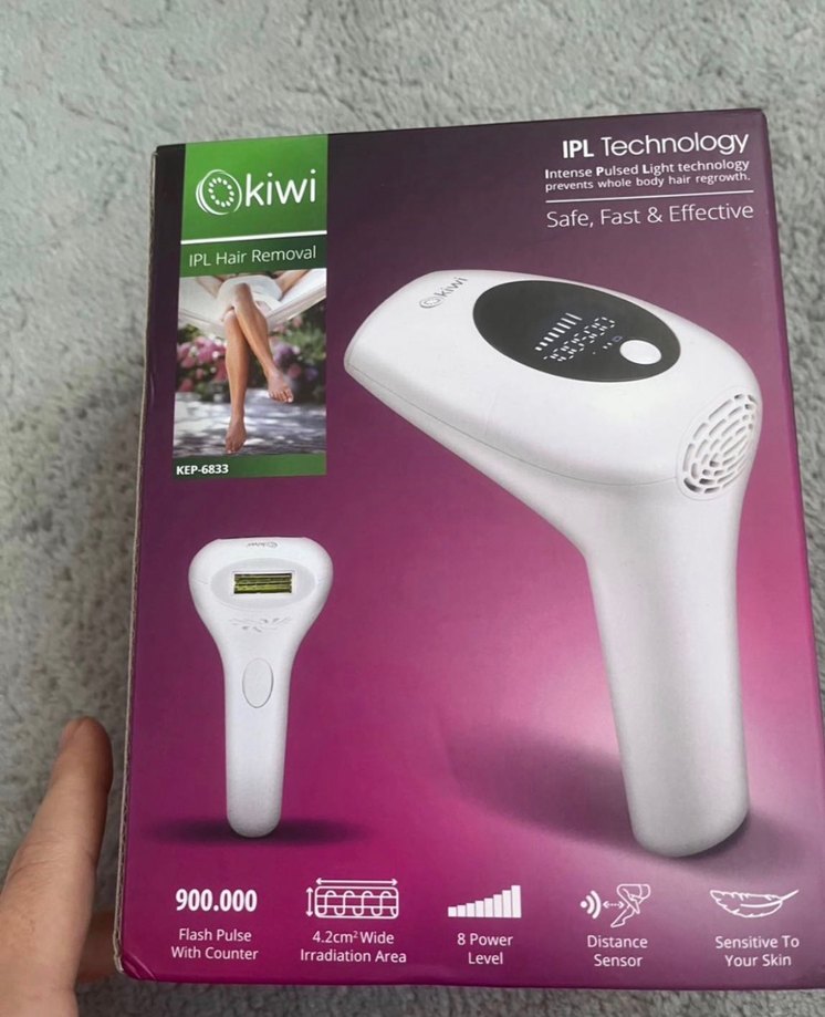 Kiwi IPL lazer epilasyon cihazı 900.000 flaş, 4.2 cm geniş ışın alanı, 8 güç seviyesi ve mesafe sensörü ile güvenli ve etkili kullanım sağlar.