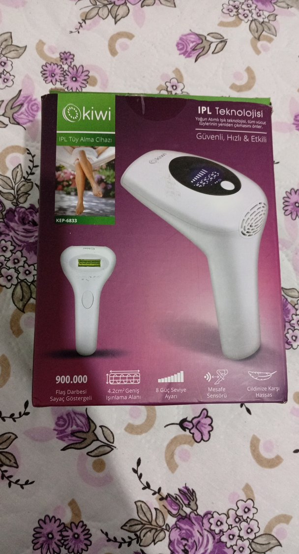 Kiwi IPL lazer epilasyon cihazı, 900.000 flaş darbesi, 3.2 cm² geniş ışınlama alanı, 8 güç seviyesi ayarı, mesafe ve cilt tonu sensörü ile güvenli ve etkili kullanım sağlar. ⚡