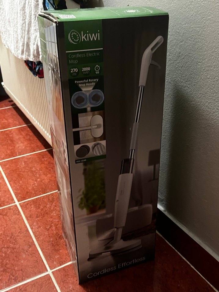 Kiwi kablosuz elektrikli mop, güçlü döner mop başlığı ve 270W güç ile etkili temizlik sağlar. Yeşil ve gri renklerde tasarlanmıştır.