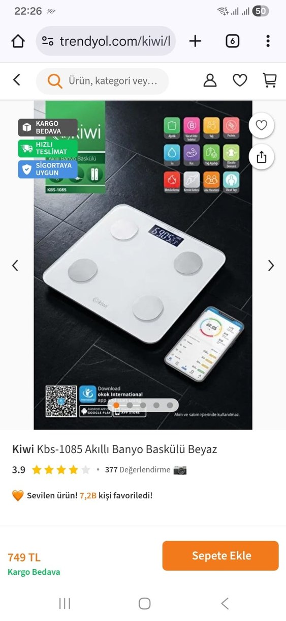 Kiwi Kbs-1085 beyaz akıllı banyo baskülü, dijital ekranlıdır ve sağlık verilerini mobil uygulama ile takip eder. 1 yıl olmadı alalı. Fazlalıktan satıyoruz