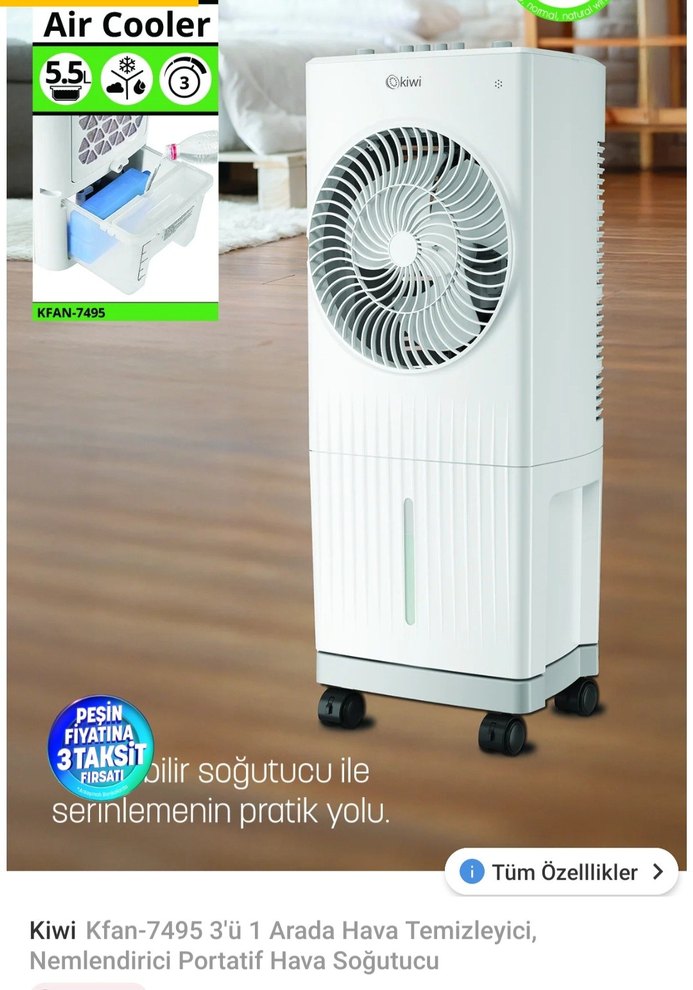Kiwi Kfan-7495, hava temizleyici, nemlendirici ve portatif hava soğutucu özelliklerini bir arada sunar. Tekerlekleri sayesinde kolay taşınır, pratik soğutma sağlar. ❄️