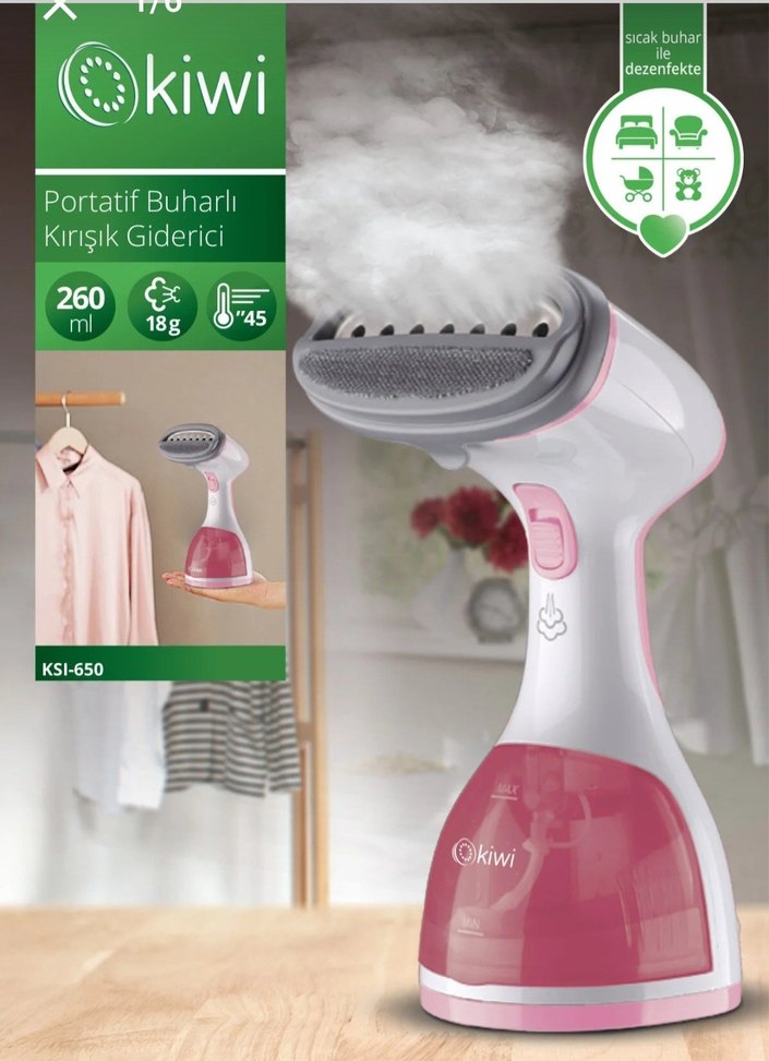 Kiwi KSI-650 modeli, 260 ml su kapasitesine sahip, 18g ağırlığında ve 45 saniyede ısınan portatif pembe buharlı kırışık gidericidir. Giysileri buharla temizler ve dezenfekte eder.