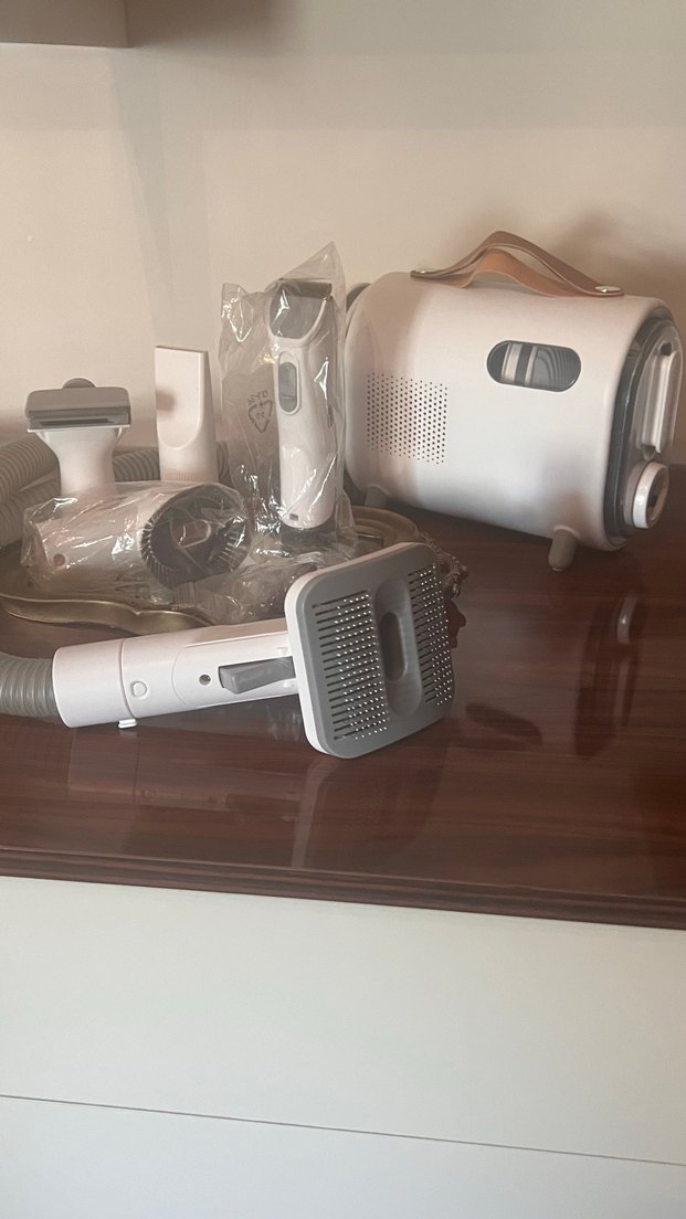 Beyaz ve gri renkte, taşıma saplı kompakt ana ünitesi ve çeşitli başlıkları bulunan kedi köpek bakım seti