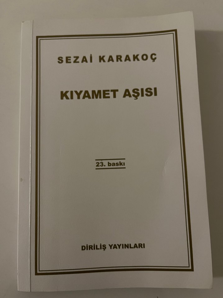 Sezai Karakoç'un 23. baskı "Kıyamet Aşısı" şiir kitabı, Diriliş Yayınları tarafından yayımlanmıştır. Kitap iyi durumdadır. İki sayfa fosforlu kalem işareti vardır.