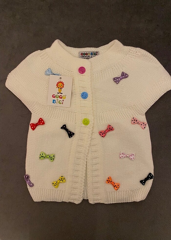 Yeni etiketli bebe yelek 0-1 ve 1-2 yaş mevcuttur Rengarenk fiyonk ve düğme detaylı