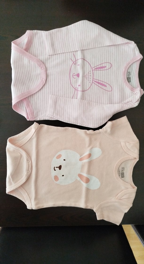 İki adet pastel pembe kız bebek bodysi; biri kısa kollu ve tavşan baskılı, diğeri uzun kollu çizgili tavşan yüzü baskılı, elastik detaylı.