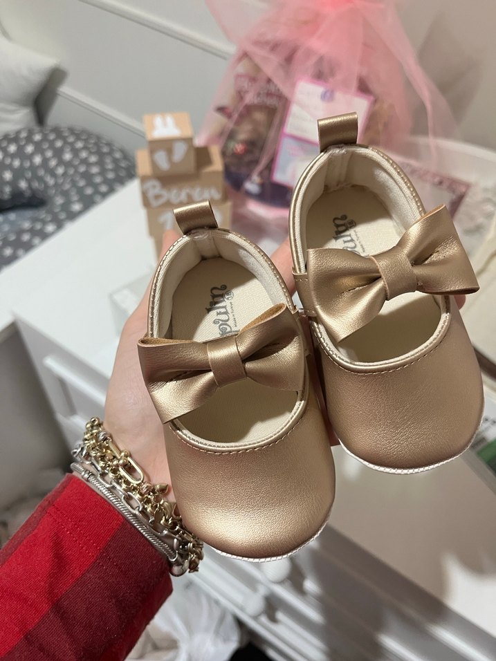 Parlak altın renkli, fiyonk detaylı kız bebek ilk adım ayakkabısı. Yumuşak kauçuk malzemeden üretilmiş, klasik sokak stiliyle uyumlu 6 ay kınasında sadece 2 saat kullanıldı Ürün tertemiz hiçbir kusuru yok