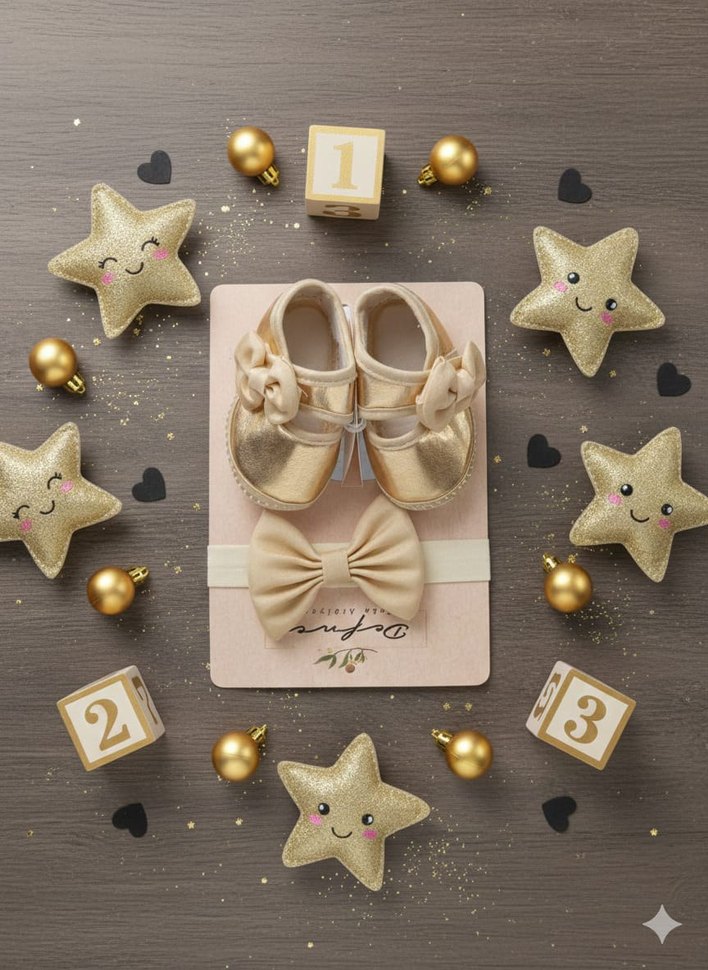 Kız Bebek Altın Renk Fiyonklu Patik Ve Sac Bandi