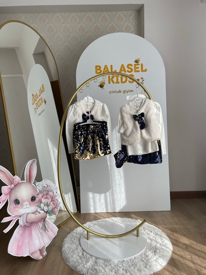 Altın renginde, uzun kollu ve kürk detaylı kız bebek takımında baskılı desen ve uyumlu aksesuar bulunur. Payetli çantalı 4lü takım 2-3-4-5 yaş bedenleri mevcut
