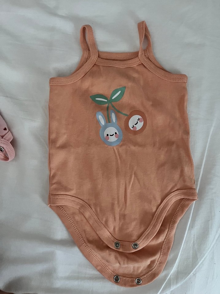 Askılı kız bebek bodyler, sevimli baskılı desen ve alt kısmında çıtçıt düğmeli. Lekesi yırtığı yok göründüğü gibi