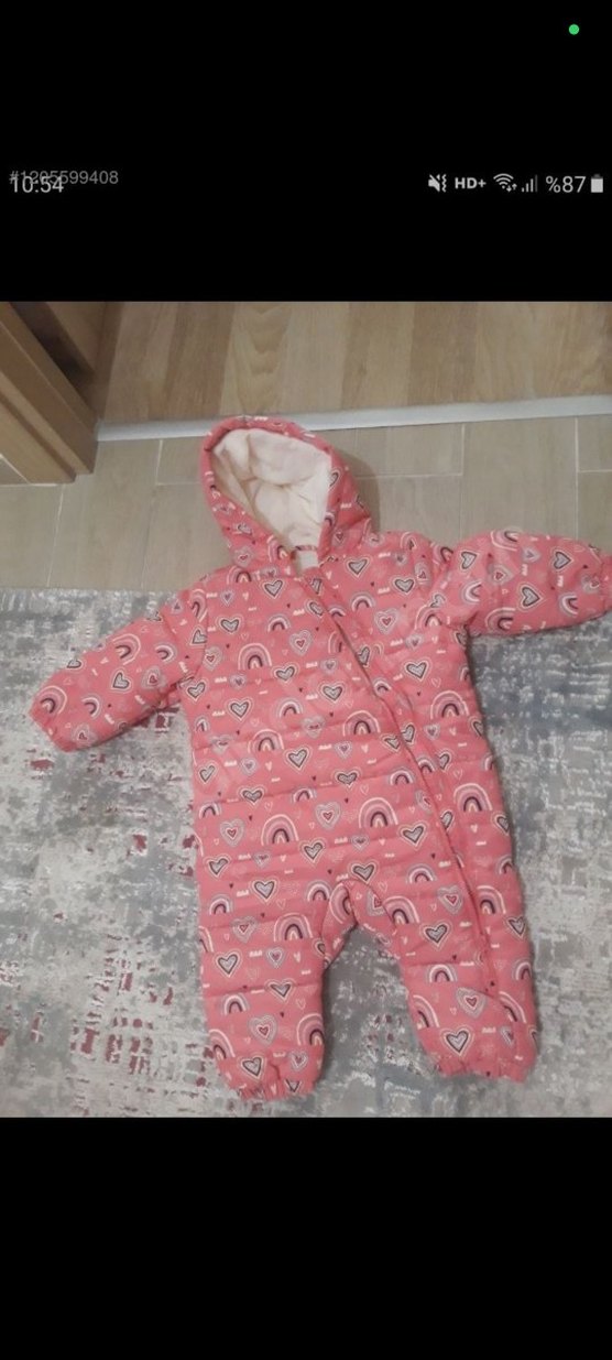 Kapüşonlu, içi kürklü, pembe tonlarında kalp desenli kız bebek tulumu. Soğuk havalar için sıcak ve rahat. ❄️ hiç kullanılmadı etiketi yok yıkayıp kaldırmıştım