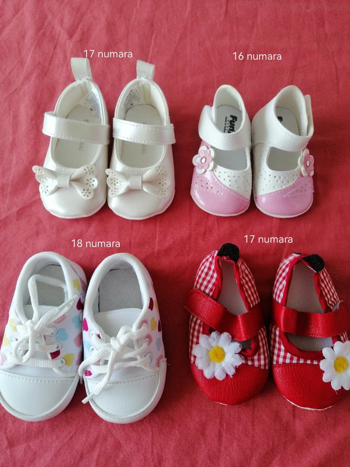 Renkli nakışlı ve Velcro bağlamalı kız bebek ilk adım ayakkabıları, kauçuk tabanlıdır. 16, 17 ve 18 numara seçenekleri mevcuttur. Bebegimin ayakları cok tombul oldugu için hiç giydiremedim.