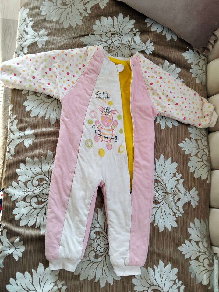 orta kalınlıkta hiç bir sorunu yok 4 yaş 75 cm uzun iki kol aradı 35 cm pembe renkli kız bebek tulumu, baskılı kollar ve önünde sevimli desen bulunur. Fermuarlı ve straplez yakalıdır.