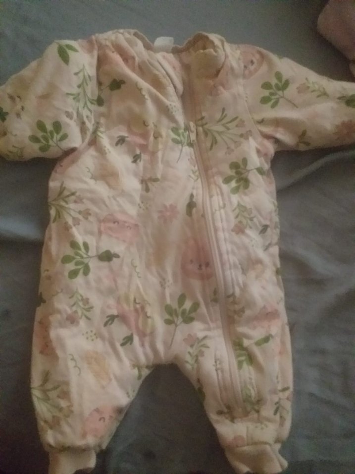 Bej renkli kız bebek tulumu, pastel tonlarda, yakalı ve desenlidir. Ön kısmında fermuar bulunur. ❄️üç adet kiyafet tek fiyat az giyinilmis iyi durumda.