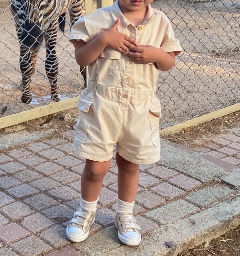 Kızlar için pamuklu, bej renkli, kısa kollu ve düğmeli rahat kesim tulum. Sokak stiline uygun konforlu tasarım.