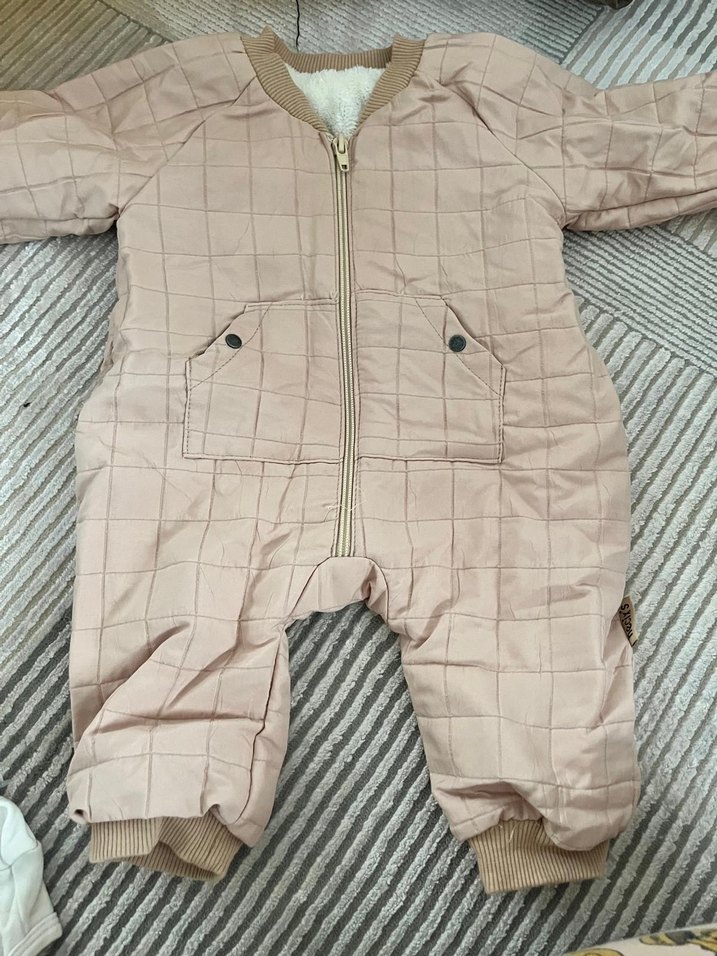 Bej renkli, fermuarlı kız bebek kar tulumu. Yumuşak kapitone kumaş, ön cepler ve ribanalı manşetlere sahiptir. ❄️