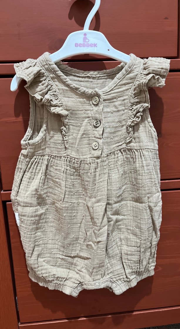 Kız bebekler için bej renkli, yumuşak kumaşlı ve omuzlarında fırfır detaylı tulum, önünde düğme kapamalı. Müslin kumaş 1 kere giydi kızım