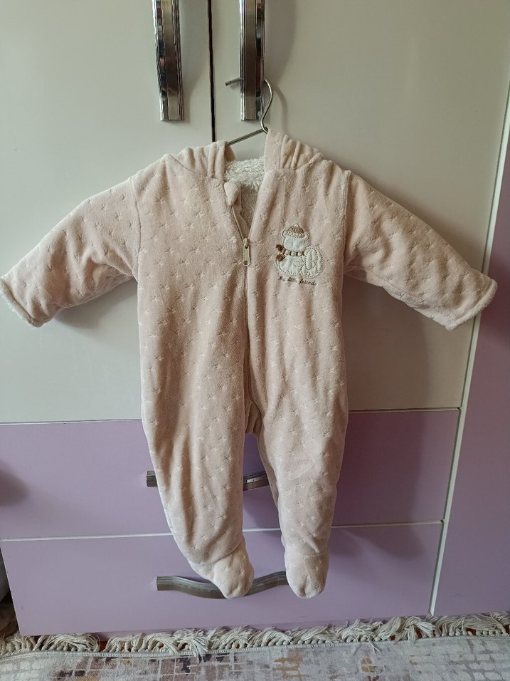 Bej renkte, kürk detaylı ve yakası kesimli kız bebek tulumu. Pastel tonu ve yumuşak dokusu soğuk günler için sıcaklık sağlar. ❄️