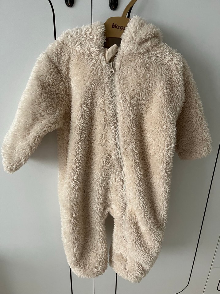 Yumuşak kürk detaylı, bej renkli, yuvarlak yakalı kız bebek tulumu. Desensiz ve soğuk hava için sıcak tutar. ❄️