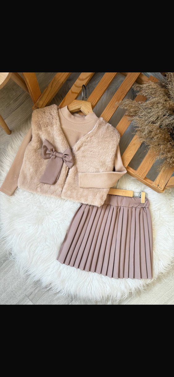 Bej tonlarda, yumuşak kürk detaylı uzun kollu üst ve fiyonk aksesuarlı pilili etekten oluşan kız bebek takımı.