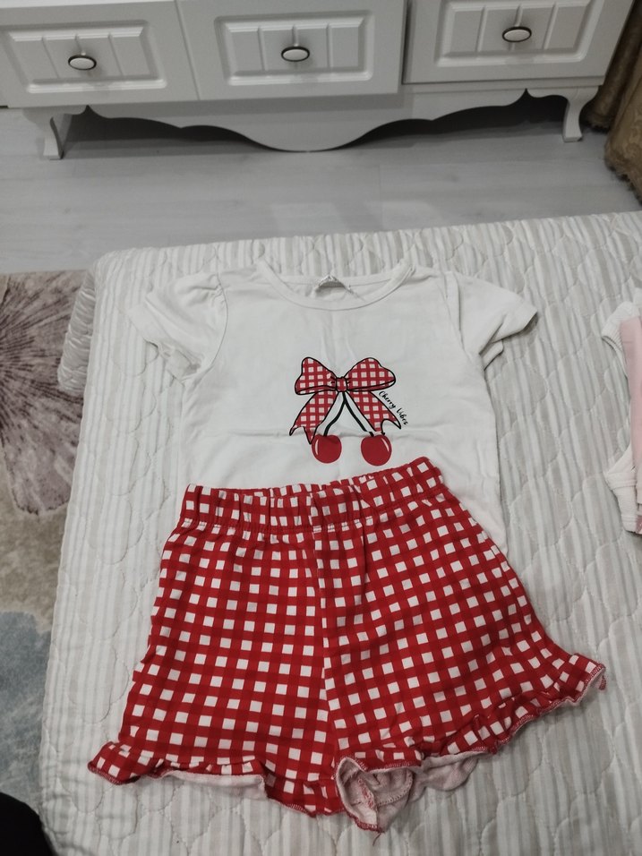 Kısa kollu beyaz üst, fiyonk ve kiraz baskılı, kırmızı beyaz kareli fırfırlı şortlu kız bebek takımı.