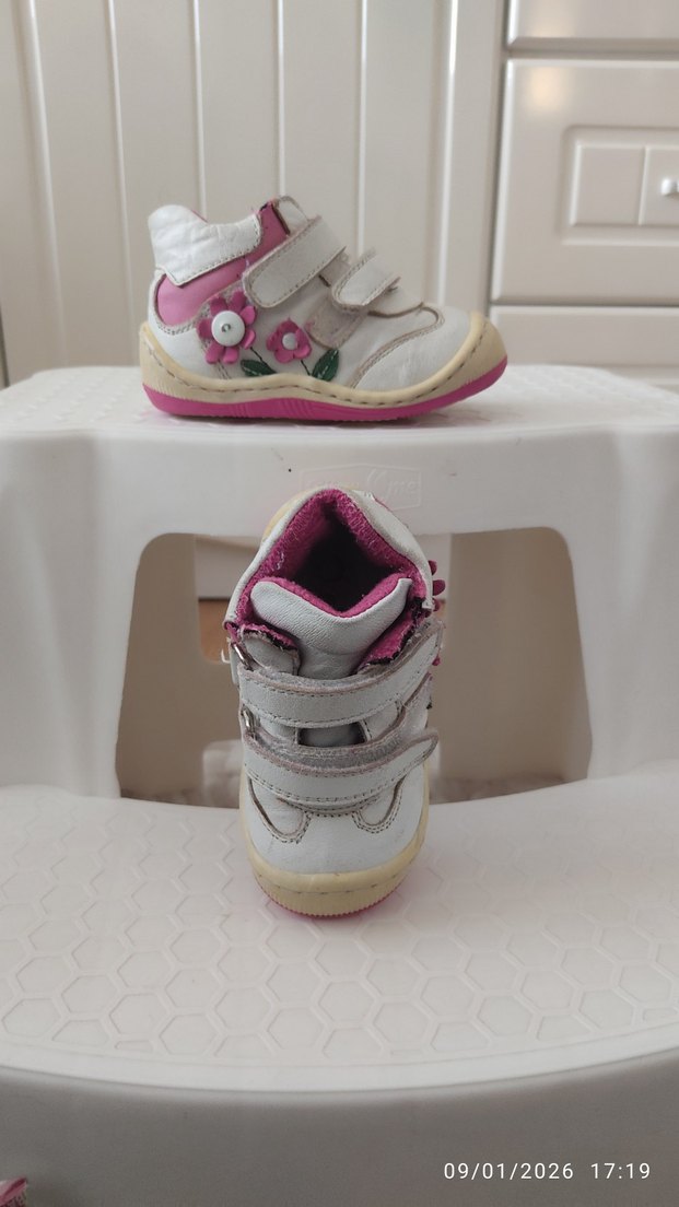 Beyaz renkli, cırt cırtlı ve kauçuk tabanlı kız bebek ilk adım ayakkabısı. Çiçek desenleri ve pembe detaylarla şık ve rahat. ortopedik.