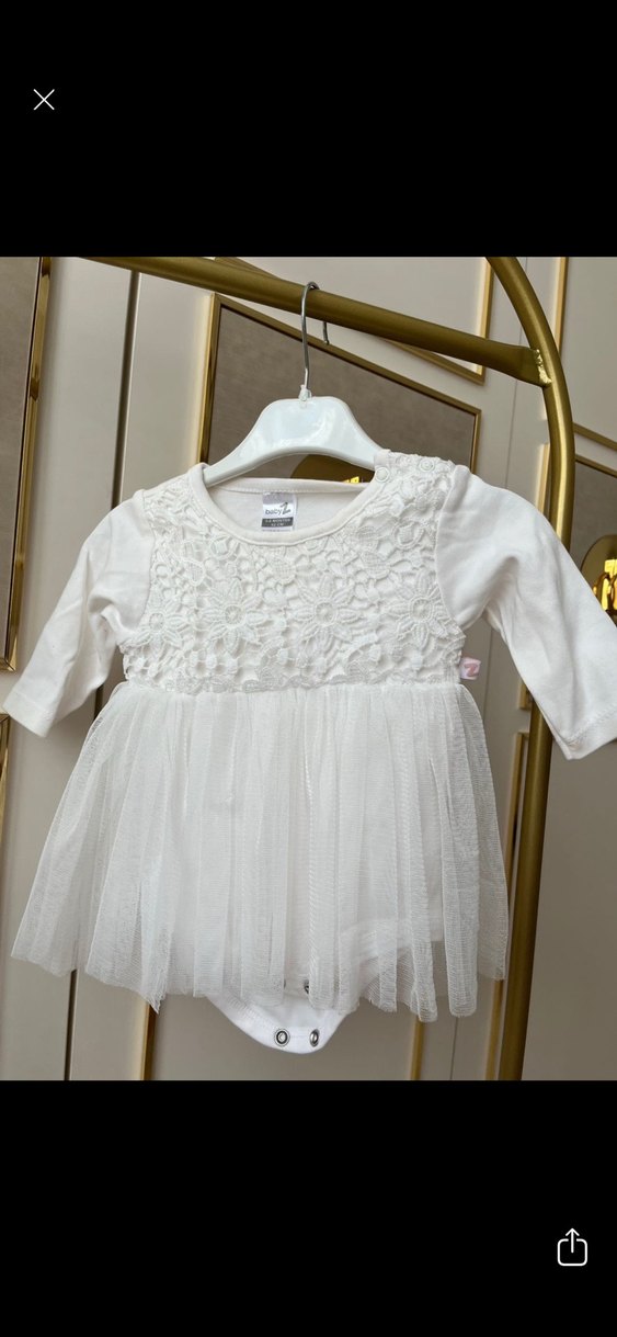 Pamuklu, uzun kollu beyaz kız çocuk elbisesi. Dantel işlemeli üst kısmı ve tül etek detayıyla modern klasik tarzda, bol kesim.