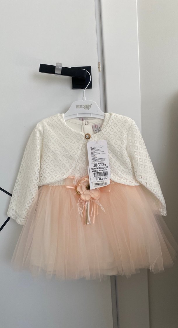 Beyaz dantelli üst ve pastel şeftali tül etekli, uzun kollu, fitted kesim kız çocuk elbisesi. Yuvarlak yaka, modern klasik tarz, BULSEN markası.