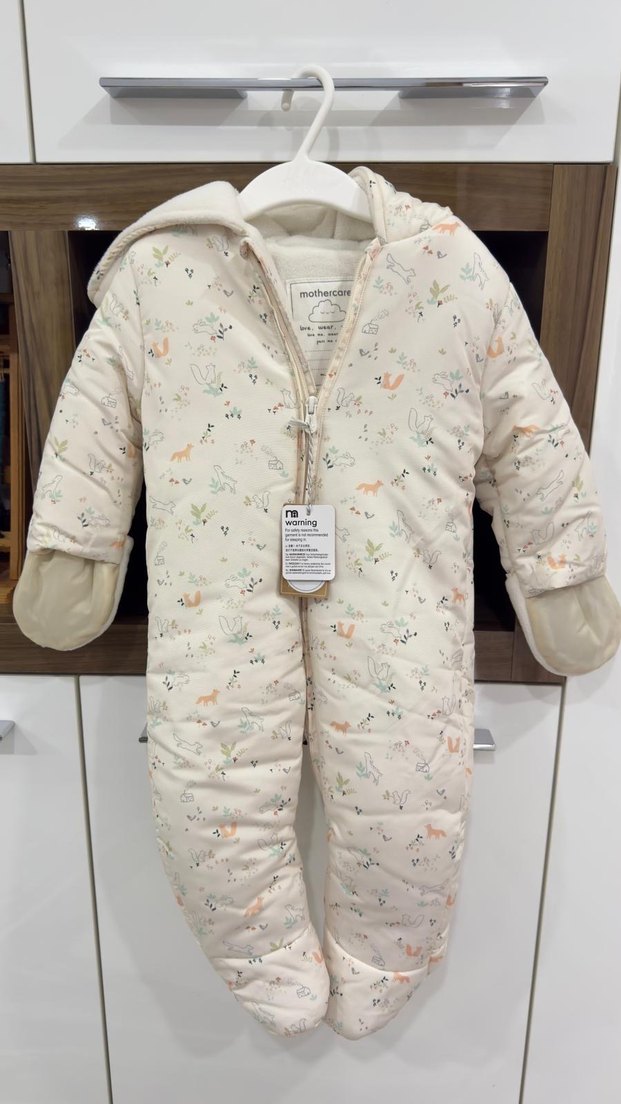 Pastel beyaz renkte, desenli ve kürklü detaylara sahip kız bebek tulumu, yakasında kesimli yaka bulunur.