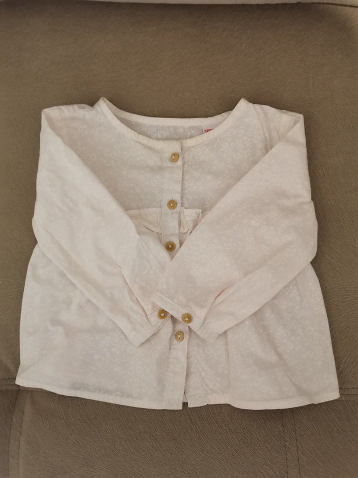 Kız çocuklar için uzun kollu, yuvarlak yakalı, yumuşak kumaştan yapılmış, bol kesim ve sırtında fırfırlı detay bulunan pastel beyaz çiçek desenli bluz. 3-6 ay