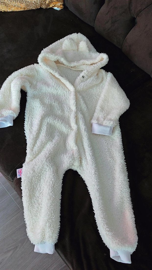 Yumuşak peluş kumaştan yapılmış, kapüşonlu beyaz kız bebek tulumu. Sıcak tutan ribanalı manşetlere sahiptir. ❄️